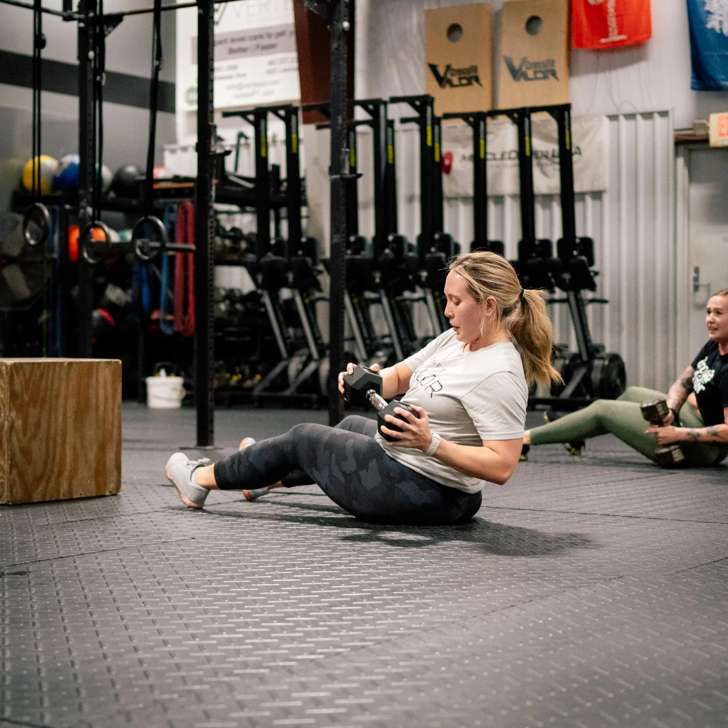20 Dumbbell Box Step Overs (24/20) (50/35)